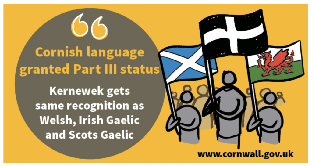 The Cornish language, Kernewek, will be recognised alongside Welsh, Irish Gaelic and Scots Gaelic after the government recommended it for Part III status – the highest level of protection under European treaty.