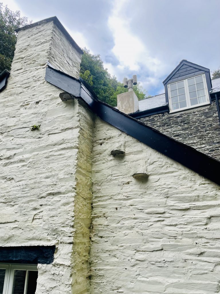 Southern facing chimney on Trevillett Mill with three ‘Witches Stones’ visible.